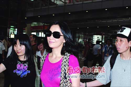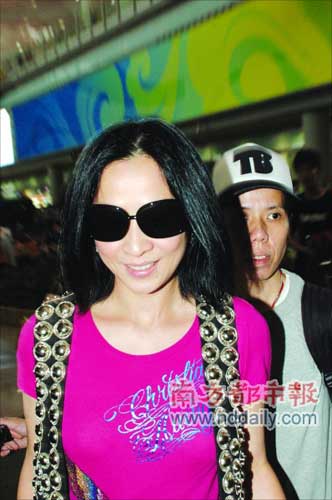 与以往大队人马护前应后的场面不同的是,此番刘嘉玲一行只有二人,走出安检后,一名女子上前接应。刘嘉玲一路电话未停,手拎新款粉色香包,镶嵌银饰的马甲格外耀眼。