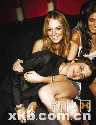 女星林赛·洛翰与同性女友萨曼莎·罗森(Samantha Ronson)现身第60届艾美奖庆功派对。萨曼莎亲昵地倒在林赛的腿上,就像一个撒娇的小孩。