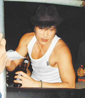 李秉宪在凌晨派对上玩到尽兴时脱去上衣,只剩白色小背心。