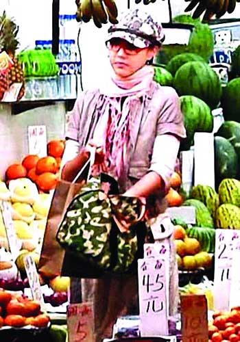 不知道她这身莫名其妙的打扮是否过分“独特”,身旁一名女子也不禁打量她,但周海媚不予理会。之后周海媚再到附近一间水果店买樱桃(右图),付款后,她边走边把樱桃放进手袋内离开。