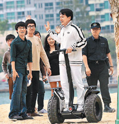 成龙忙拍电影、忙公益慈善,环保也是他重视的课题,由他代理的塞格威(SEGWAY)单人双轮电动滑板车,将成为圣淘沙主要代步工具,昨天成龙抵达到新加坡推广这活动,目前圣淘沙引进50台,并计划在两年内增加至200台,让旅客随意往来岛上各景点。