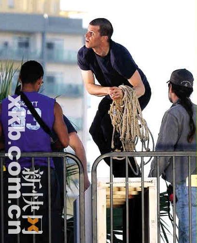 日前,温特沃斯·米勒和他的特技替身在加州的玛丽安德尔湾为剧集《越狱》拍摄一幕动作戏场景。特技替身和米帅一样的发型、一样的穿着,不凑近看,很难发现破绽。
