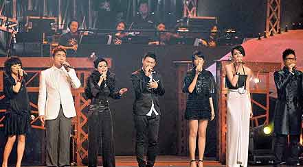 许志安(左二)、陈洁灵、张学友、莫文蔚、梁咏琪、苏永康等歌手,前晚合唱追思张国荣。
