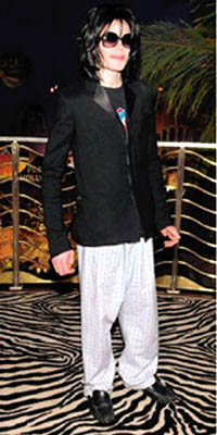 杰克逊近年饱受不利消息困扰,被指周身债之余,唱片销量也大缩水,不过并没有影响他庆祝50大寿的心情。上周四他现身赌城Planet Hollywood餐厅,与11岁儿子Prince Michael、10岁女儿Paris及6岁幼子Blanket一起吃晚饭,当日杰克逊心情甚佳,对记者面露笑容,他坐着轮椅,全身用大披风紧包,看来十分虚弱,而他拍照时西装外套下露出的睡裤,格外引人注意。