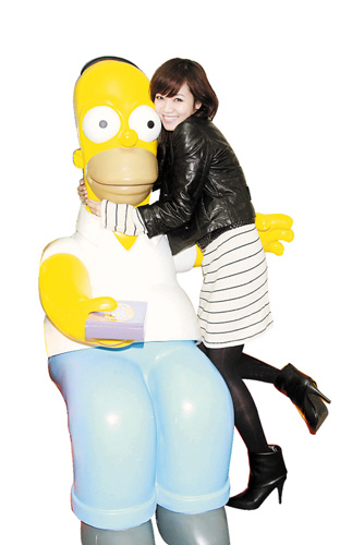 侯佩岑跟现场卡通片《辛普森家庭》一主角的大型塑像合影。