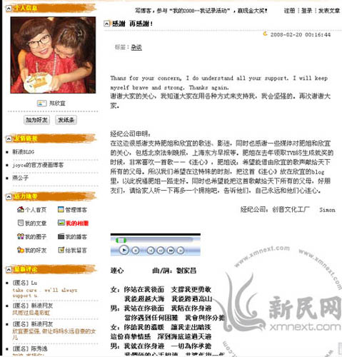 在这边很感谢支持肥姐和欣宜的歌迷、影迷,同时也感谢一些媒体对肥姐和欣宜的关心,包括北京法制晚报,上海东方早报等。肥姐在去年领取TVB终生成就奖的时候,非常喜欢一首歌——《连心》,肥姐说:希望能借由欣宜的歌声献给天下所有的父母。所以我们希望在这特殊的时刻,把这首《连心》放在欣宜的blog里,以此祝福肥姐一路走好。同时也希望能把这首歌献给天下所有的父母,好朋友们,请给家人听一下再多一个拥抱吧,告诉他们,自己永远和他们心连心。