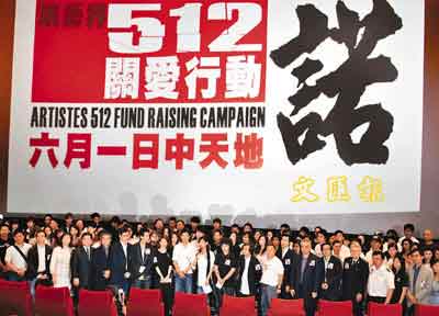 据香港文汇报报到,昨日近两百余演艺界人士参加了记者会,短短十五分钟谈话便结束,会上先由活动召集人刘德华发言,他先为各界的支持致意,华仔又哽咽地说:“四川大地震发生,演艺界短短时间内发起行动,大家劳心劳力,但这份热情不是一时三刻,重建需时要三、五、七年,重建灾民的生活,是我们的承诺,我特别多谢中联办及香港电影发展基金于行动中的协助,以及西九龙中天地六月一日借出场地举行赈灾大汇演,由于时间仓卒,不够时间向有关政府部门申请,但深信活动会得到大家的响应及支持,寄望天佑四川,天佑中国。”