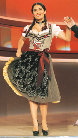 墨西哥性感女星萨尔玛·海耶克近日盛传与法国名牌大亨皮诺前日登上德国电视节目《Wettendass...?》,并穿上当地传统服饰大跳土风舞,低胸的上衣令其36C上围呼之欲出,连同场的名牌Chanel设计师“老佛爷”卡尔·拉格菲尔德也看得目不转睛。