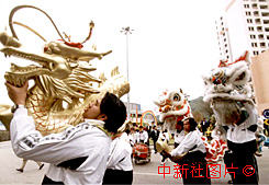 时光流逝,一些中国古老的民间习俗在许多地方都渐渐消失了,但澳门却保留得很完整。比如“舞醉龙”,在它的原产地中山市石歧,已多年看不到了,只有在澳门,才可以一睹它的风采。 澳门的传统舞狮也是这样。每年农历大年初二,都要举行“醉龙醒狮大会”。“醉龙”就是上面提到的,它与常见的舞龙不同,只有龙头和龙尾,没有龙身。舞醉龙的武师,边舞边被人灌酒,以致带有几分醉意,舞姿豪放。“醒狮”就是将一头新“狮子”点睛开光,仪式十分隆重。 武师认为,新来的狮子,只是一个陌生的道具,开光后,才会赋予其生命、灵性,才能与人融为一体,成为一头活灵活现的生灵。开光时,要在案上铺上红布,摆上一只烤乳猪,一只白鸡供奉神祉,继而燃放鞭炮,敲锣打鼓。担任点睛开光重任的,当属资格最老、最年长、最备受敬重者。他在狮头上洒几滴清水,用朱红的笔点在狮子的眼睛上,于是狮子开始蠕动,慢慢抬起头,突然之间跳跃起来,随着鼓乐抖擞身躯,象是长眠之后的猛醒。开光之后,在场的人都要分食一块烤乳猪,据说吃了以后可以强身健体,久战沙场,百战百胜。