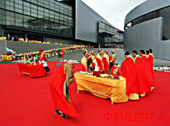澳门文化中心揭幕典礼上正在举行宗教祈福仪式。该文化中心座落在澳门新口岸填海区海边,其建筑造型设计新縪,将成为澳门城市的一个标志。