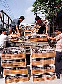 象征1999年的1999只信鸽将于九月九日在澳门的大三巴牌坊前放飞返回广州。这项名为“信鸽竞翔报归讯”的活动,将揭开九月十一日澳门回归祖国倒计时一百天纪念活动的序幕。图为广州市信鸽协会正将征集的信鸽运往澳门。