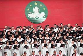 北京十五家文艺团体十日下午在天安门广场举行“迎澳门回归倒计时一百天大型音乐会”。来自香港、澳门和内地近千名歌唱家在澳门特区区徽下高歌《欢乐颂》。