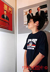 一名葡萄牙儿童三十一日在澳门观看澳门回归历程图片展中的何厚铧演讲照片。这个展览通过二百余幅图片,再现了澳门回归的重大历史事件和进程。