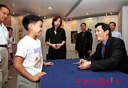 为庆祝澳门回归倒计时五十天,中国影星影人书画展三十一日在澳门举行,因饰演雍正皇帝而受到港澳观众熟悉的唐国强在现场为影迷签名。
