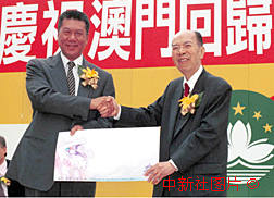 澳门各界庆祝回归活动委员会主席团主席马万祺在澳门回归倒计时五十天庆祝活动中,向澳门特别行政区首任行政长官何厚铧赠送"倒计时五十天纪念封"。