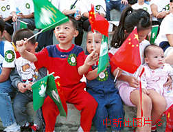 一些澳门儿童在街头挥舞中华人民共和国国旗与澳门特别行政区区旗,庆祝澳门回归倒计时五十天。