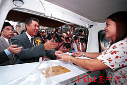 澳门特别行政区首任行政长官何厚铧三十一日在街头邮政车前,为澳门回归倒计时五十天纪念邮封加盖邮戳。