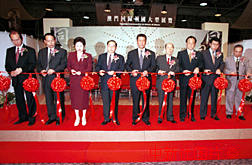 澳门回归祖国大型展览十一日在澳门开幕,澳门特区首任行政长官何厚铧、新华社澳门分社社长王启人、澳门中华总商会会长马万祺等嘉宾为展览剪彩。