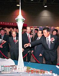 澳门回归祖国大型展览十一日在澳门开幕,澳门特区首任行政长官何厚 (右一)、新华社澳门分社社长王启人(右二)、澳门中华总商会会长马万祺(右四)、澳门旅游娱乐有限公司董事总经理何鸿 (右三)观看兴建中的澳门观光塔模型。