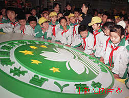 "世纪龙腾庆回归"喜迎澳门回归大型展览,十二日在北京中国革命博物馆开幕,北京的小学生认真听讲解员讲述澳门的历史和特区区徽。