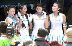 第四十六届澳门格兰披士赛车场上的赛车宣传女郎摆"甫士"供人们拍照,成为赛场上的另一风景。