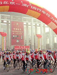 庆祝澳门回归庆典活动之一的"中旅杯九九迎回归北京至澳门自行车拉力赛"二十一日开始,十二支专业队的七十多名运动员上午九点三十分由天安门广场出发。这是中国规模最大、水平最高、距离最长的自行车比赛。