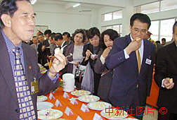 三百多位澳门各界人士19日参观解放军驻澳门部队珠海基地,许多人兴致勃勃地在食堂品尝官兵们做的各种小吃。