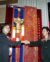 为庆祝澳门回归祖国,河南省旅游局与登封市人民政府将一柄制作精良、重五十斤的特大型少林宝剑赠送给澳门人民。图为河南省旅游局副局长方洪莲(右)向澳门政府旅游司代司长文绮华赠送宝剑。