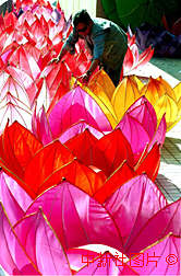 为迎接澳门回归,由自贡市制作的祥瑞观音、莲花仙子、濠镜神珠、群龙戏水等四组大型彩灯正在澳门南湾湖安装。图为工程人员对安装前的莲花灯饰进行检查。