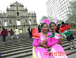 澳门少女装扮成中国古代美丽祥和的莲花仙子形象,在大三巴前参加一个庆祝澳门回归的活动。中新社传真