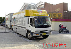 参加澳门回归报导的现场电视转播车七日陆续抵达澳门。 中新社传真 毛建军 摄
