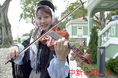 澳门回归前夕,各种庆祝活动纷纷拉开序幕,一位澳门少女身穿葡国乡村服饰,在修整一新的住宅博物馆前演奏。