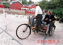 许多外国游客回归前亲临澳门,乘坐独特的人力三轮车观赏葡萄牙当年登上澳门的妈阁庙。中新社传真