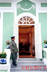 澳门保安人员在葡国建筑特色的博物馆前执勤