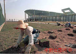 澳门回归前夕,女工在政权交接仪式会场外铺设草坪. 中新社传真 王瑶
