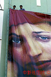 澳门回归充满商机,一家国际时装连锁店在闹市高楼上挂起巨幅人像吸引顾客。