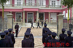 16日上午,在蒙蒙细雨中的澳督府门前举行降旗演练仪式。