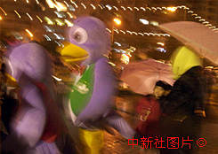 澳门回归吉祥物"回归燕"十六日夜冒雨参加庆回归亮灯仪式。