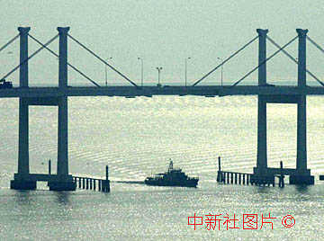 中国军舰航行在澳门回归交接仪式场地附近的友谊大桥下,保证海域和交通的平安。