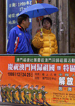 澳门民间的庆回归活动陆续展开,预告解放军歌舞团演出的海报出现在大街小巷。中新社传真 宗金柱 摄
