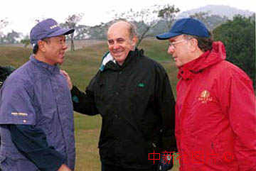 葡萄牙总统沈拜奥(右一)、澳门总督韦奇立(右二)与澳门特别行政区首任行政长官何厚铧冒雨在澳门高尔夫球俱乐部切磋球艺。中新社传真 毛建军摄