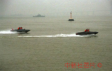 中国武警巡逻快艇十九日在澳门海域的阴雨天气中穿棱,保卫回归庆典。中新社传真 彭振戈摄