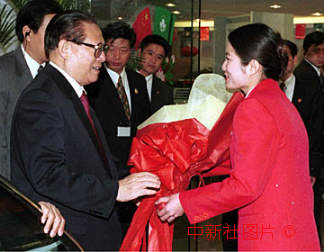 江泽民主席十九日中午抵达下榻的澳门濠景酒店,受到工作人员的热情欢迎。 中新社传真 毛建军摄