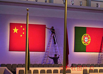 交接仪式即将来临,工作人员一丝不苟的在整理国旗。中新社数码传真 毛建军摄