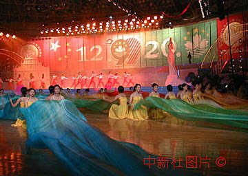 19日晚,珠海市举办多台文艺晚会迎接澳门回归。图为珠海体育中心上演的《我们九九在一起》。作者:萧琨