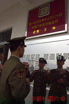 即将进驻澳门的解放军战士在珠海军营回归倒计时牌前整理军容。中新社数码传真 王瑶摄