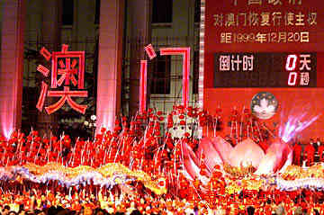 一九九九年十二月二十日零点零分,北京天安门广场澳门回归倒计时牌前一片欢腾。(本社记者天安门广场零点现场数码传真)作者:满会乔