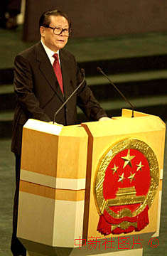 在中葡澳门政权交接仪式上,中国国家主席江泽民发表重要讲话。中新社数码传真 毛建军摄