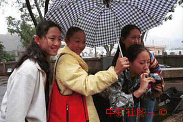 前来澳门参加欢庆回归文艺演出的北京女艺员,十八日在小雨中到妈姐庙前观光拍照。 中新社传真 彭振戈摄