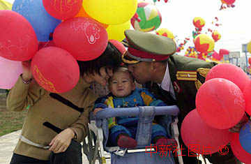 驻澳部队通讯兵黄立新和前来送行的妻子,一岁的儿子告别。中新社数码传真 王瑶摄